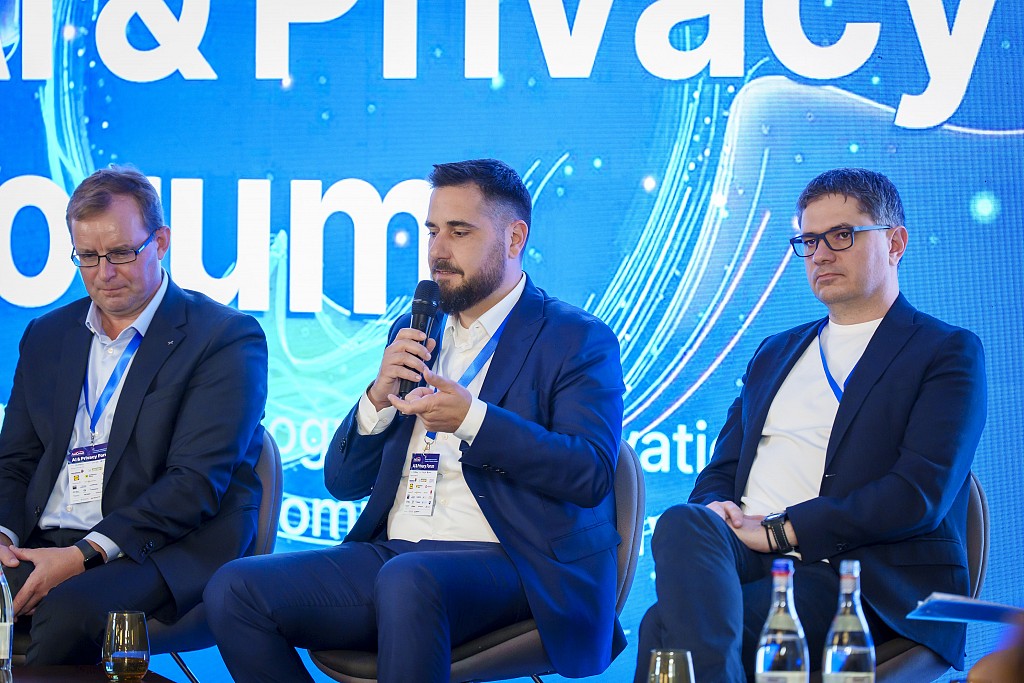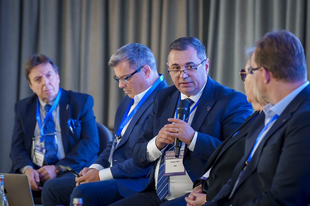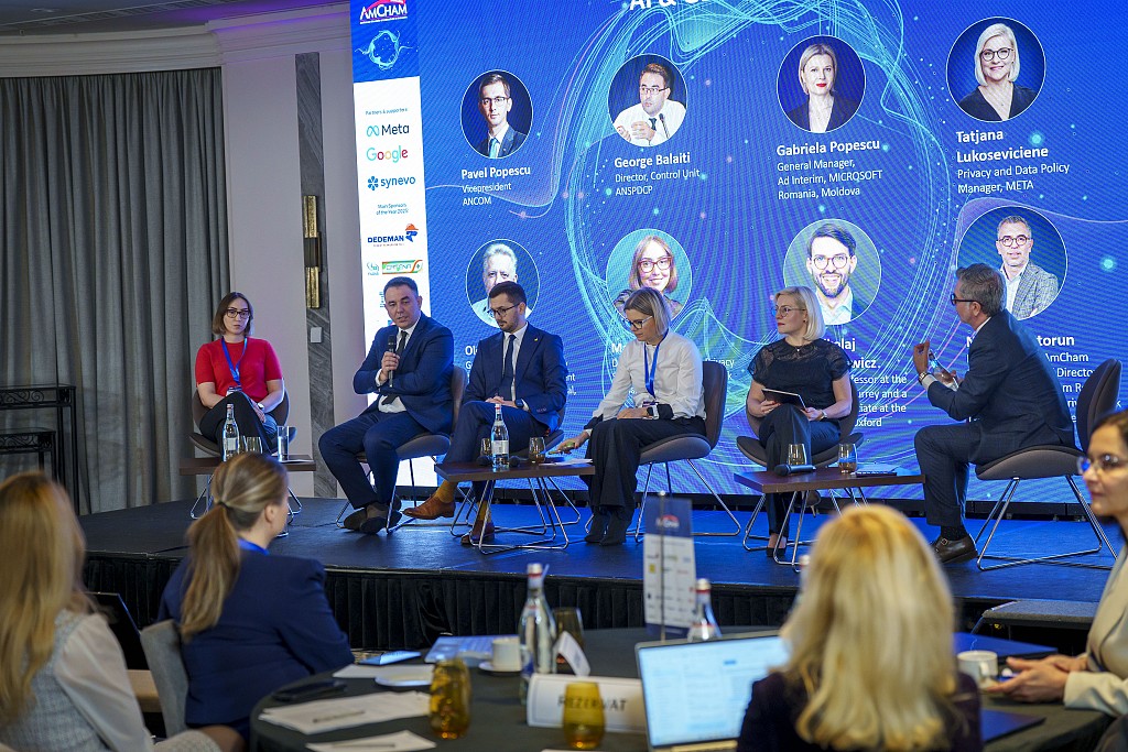 The first panel, featuring representatives from ANCOM, ANSPDCP, Microsoft, Meta, IBM, Synevo, Academia, focused on the complex relationship between AI innovation and data protection within the European and global landscape.