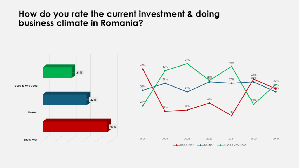 AmCham Romania shartes the results of the 7th annual survey on Romania’s investment and business climate, which signals a sharp deterioration in private sector confidence: only 21% of companies now assess the situation as good or very good, compared to 45% in 2024, with confidence level falling even below the level of 2020, an year marked by recession and the uncertainties generated by the COVID-19 pandemic.