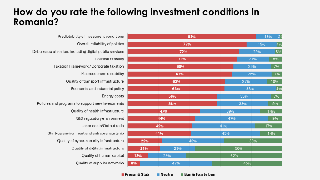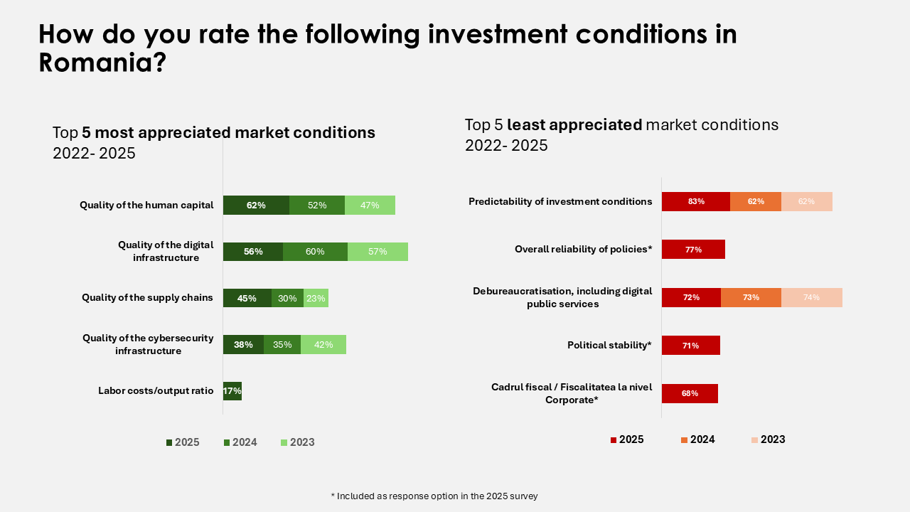 By contrast, the predictability of investment conditions has followed an opposite trend, deteriorating significantly and consistently over the past three years and reaching 1st place in 2025 as the least appreciated market condition. This is a worrying development and one that places Romania at a disadvantage in the European and global context of the ongoing reconfiguration of economic and production flows.