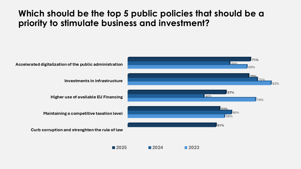 Despite volatility and uncertainty, responses highlight the structural resilience of the business environment and the potential for sustainable economic recovery. Most participating AmCham member companies view Romania not merely as a short-term speculative market, but as a strategic market for medium-term business expansion and consolidation.