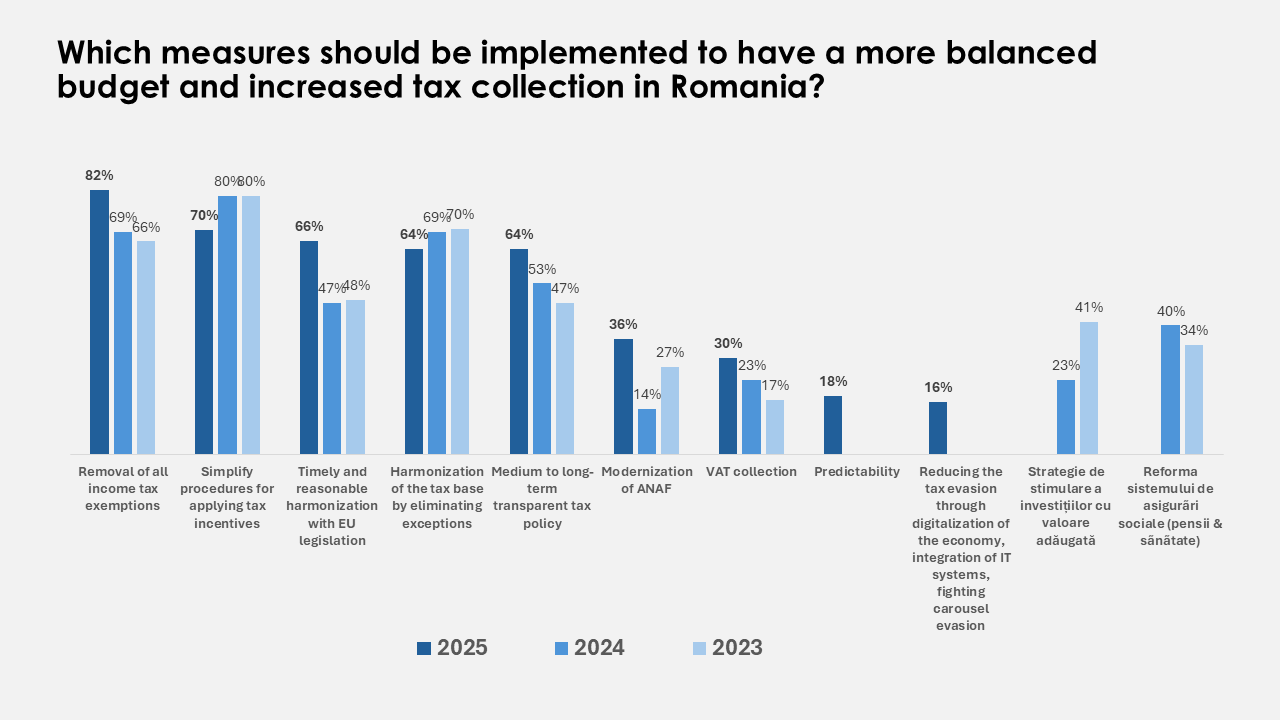 It is worth noting that the first two measures gathering the highest number of responses refer to tax exemptions, in line with the direction assumed by AmCham Romania members to support a predictable and fair business environment, in which all companies operate under the same rules, without privileges or exceptions that may distort the market. At the same time, simplifying procedures for those incentives that are economically justified and will be maintained, correlated with the need to develop strategic sectors, highlights the need to reduce bureaucracy and administrative complexity, so that companies can apply the law easily and are not required to bear additional costs and risks.