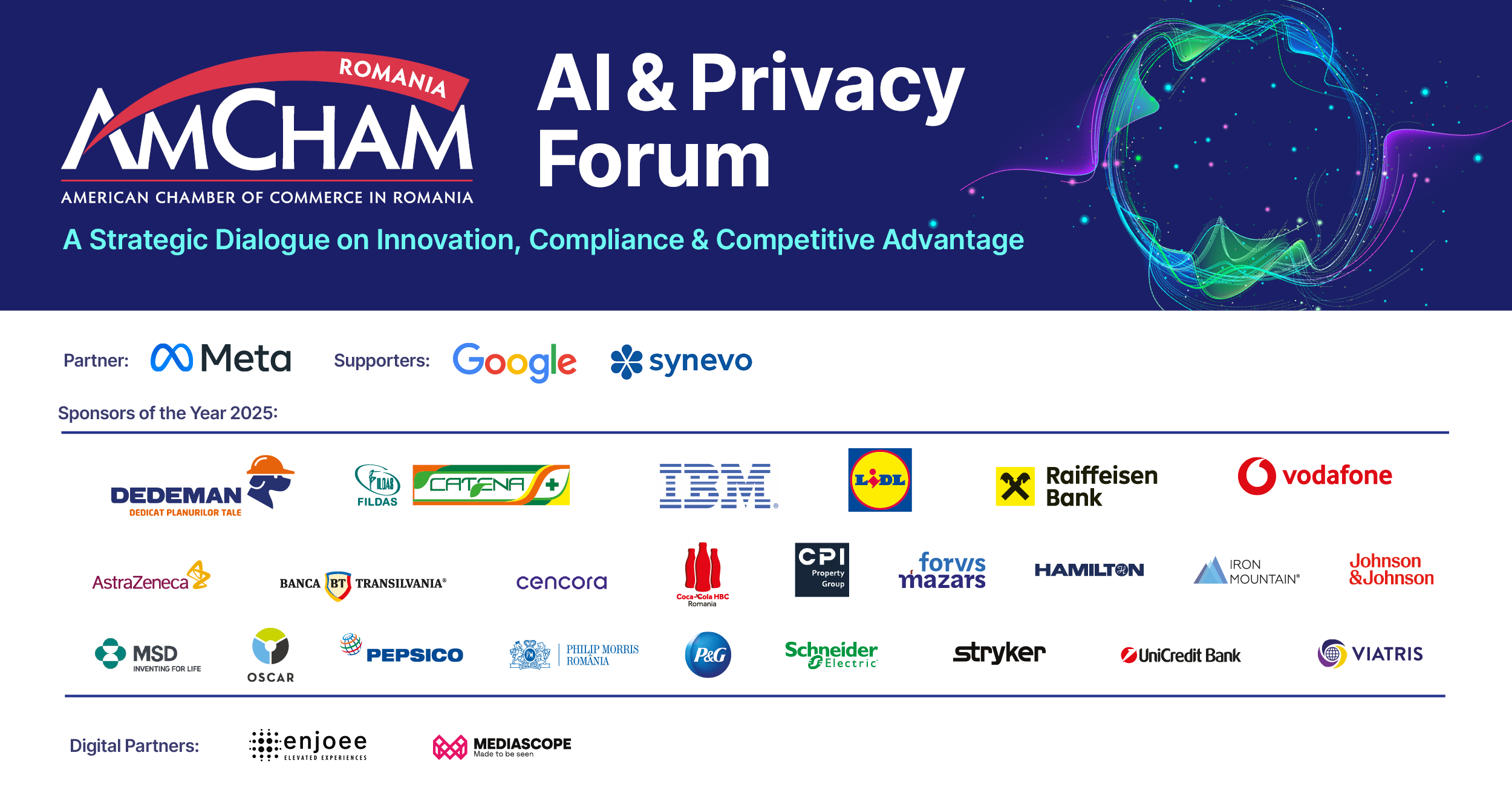 AmCham Romania is pleased to invite members to the AmCham AI & PRIVACY FORUM, scheduled for November 11, 2025, from 9:00 a.m. to 2:00 p.m., at the JW Marriott Bucharest Grand Hotel, Grand Ballroom CD.