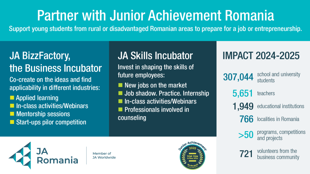 In Romania, more than 307,000 young people from over 1,900 pre-university and higher education institutions take part annually in JA’s applied learning and project-based programs, projects and competitions developed in partnership with the Ministry of Education and Research, educational institutions and JA supporters in Romania.