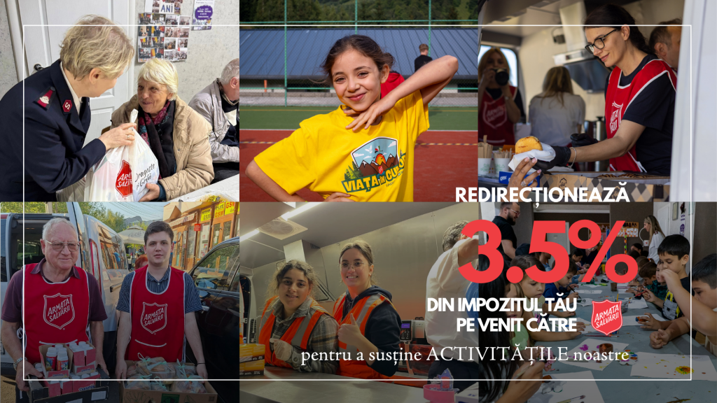 Individuals can redirect 3.5% of their income tax to The Salvation Army Romania. Completing the form takes just a few minutes and can be done online. You can support the organization at a national level or a local center in your city (Bacău, Bucharest, Craiova, Iași, Ploiești).