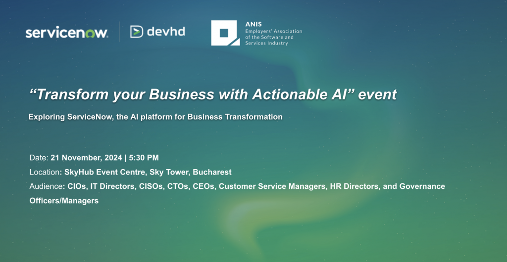 Devhd, ServiceNow Premier Partner, together with our event partners ServiceNow, invites you to an insightful live event focused on transforming business through artificial intelligence.