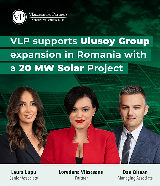 Vlasceanu & Partners (VLP) advised Turkish energy conglomerate Ulusoy Group, on entering the Romanian renewable energy market. Our team provided comprehensive local legal assistance for the acquisition of a 20 MW ready-to-build solar project in Dâmbovița County, overseeing all phases from due diligence to signing, in close collaboration with the group's counsel, Malkoç & Partners.